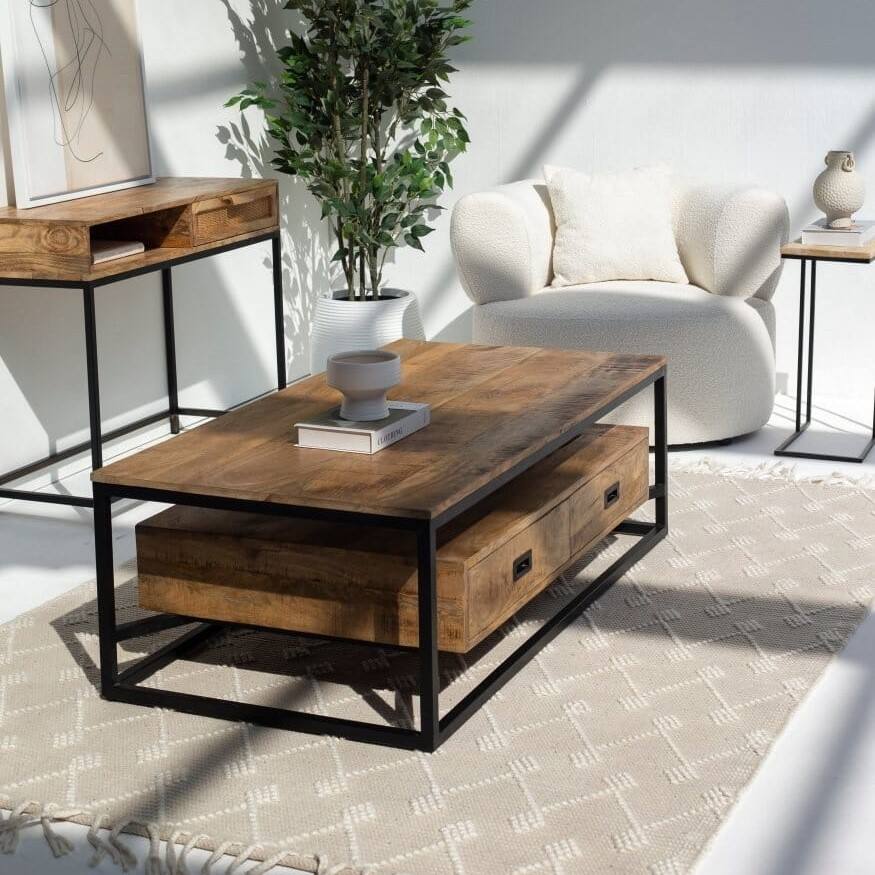 Contemporary 2-Drawer Mango Wood Coffee Table Handcrafted Solid Wooden Modern Home Hotel Use Unique Industrial Living Room