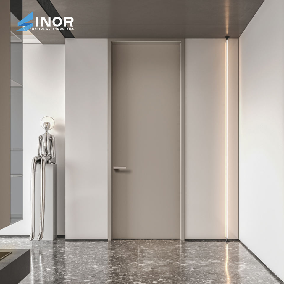 Contemporary Aluminum Wood Hybrid Interior Door for Bedroom Bathroom Slim Profile Integrated Minimalist Finger Pull Finished
