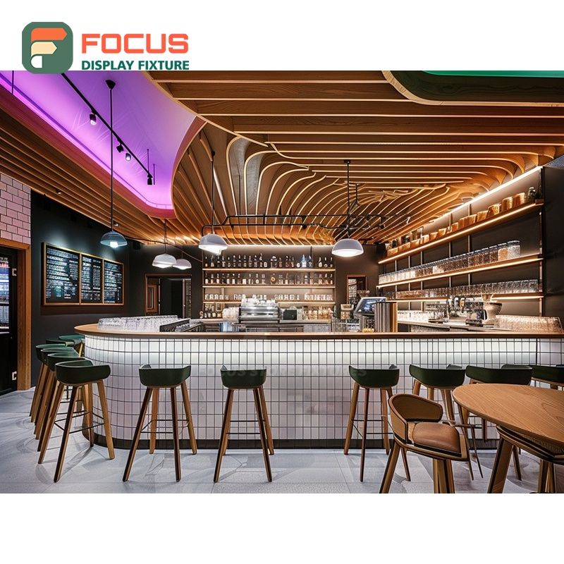 Contemporary Cafe Service Counter White Panel Finish Coffee Bag Display Area Barista Service Counter