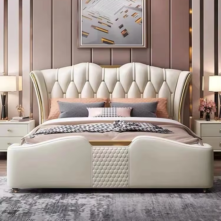 Contemporary Luxury Bed Frame King Or Queen Size Genuine Leather Upholstery Metal Leg Design Hotel Grade Bedroom