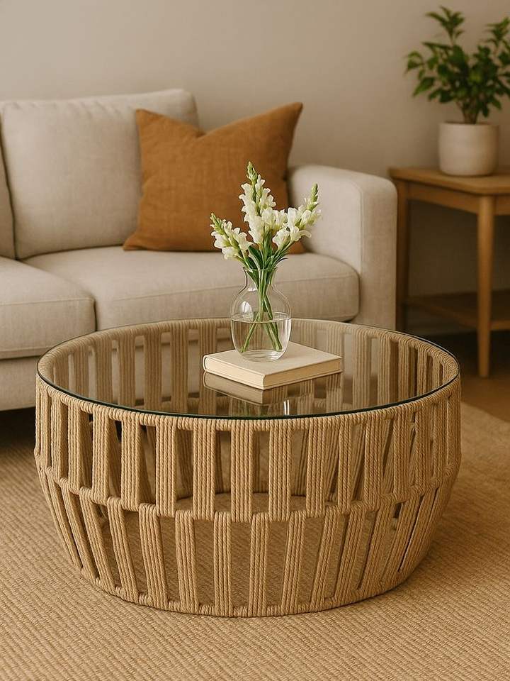 Contemporary Rope Coffee Table With Wooden Tabletop And Decorative Braided Rope Base For Modern Home Use