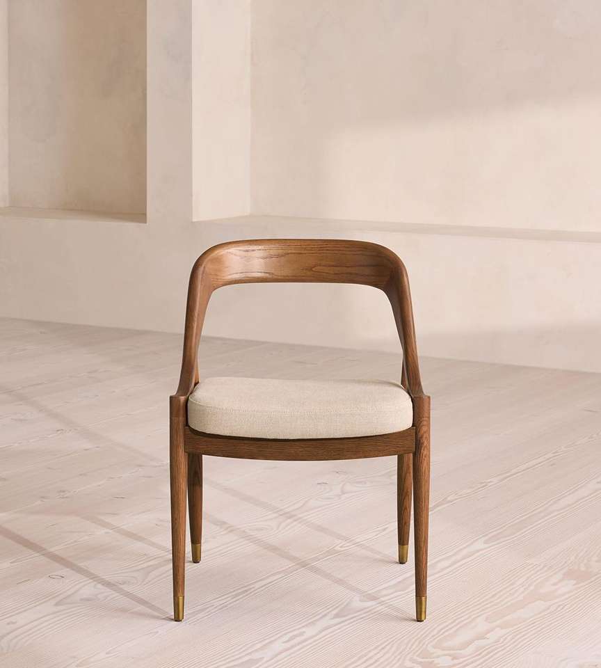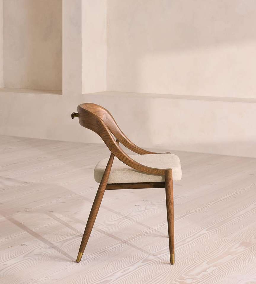 Contemporary teak Wood Chair Featuring Ergonomic Curved Frame, Textured Cushion, and Brass Details for Dining or Lounge Areas