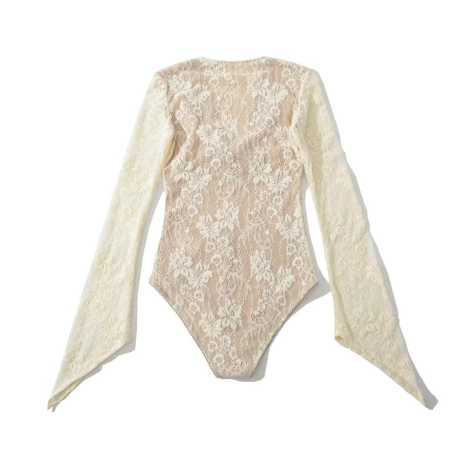 Contrast Lace Trim Deep V Neck Bodysuit Women Sexy Twist Front Long Sleeve Jumper Top See Through Mesh Lingerie Style Shirt