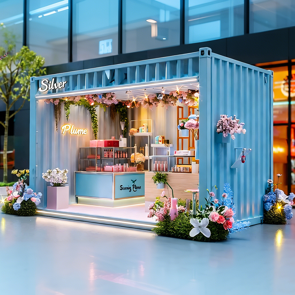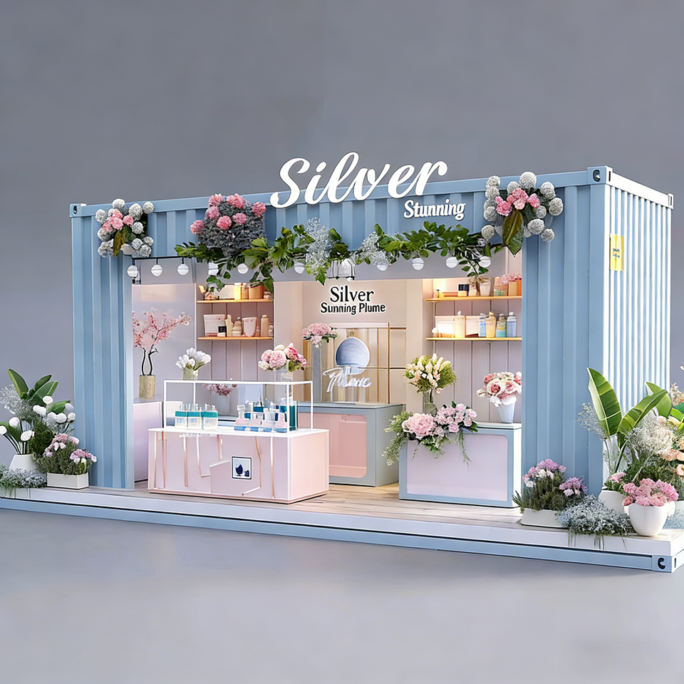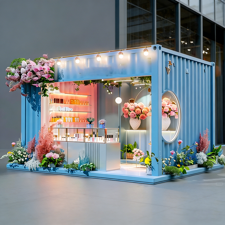 Converted Blue Container Refreshing Floral Pop-Up Shop: Multi-tier Display, Open Glass Cabinet, Round Viewing Window