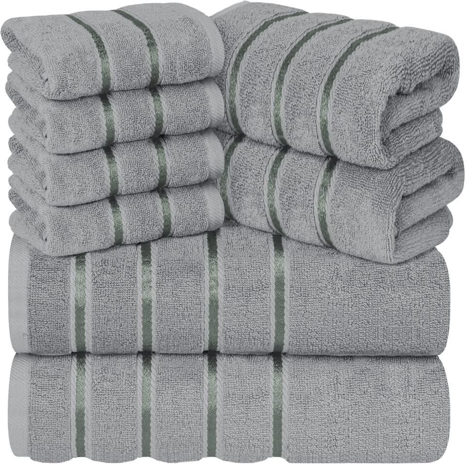 8-Piece Luxury Cool Grey 600 GSM 100% Cotton Bath Hand Towel Set Highly Absorbent Viscose Stripe Daily Use Beach Towels