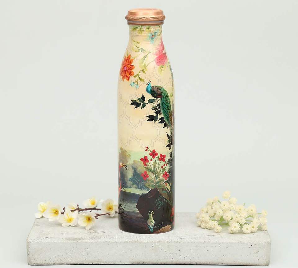 Copper Water Bottle Enamel Coated Ayurvedic Yoga Drinkware with Printed Design Health Benefits Plastic Drinkware