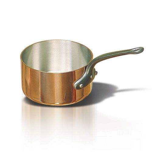 Copper metal sauce pan with traditional design and long brass handle for precise heat control and elegant vintage kitchen decor
