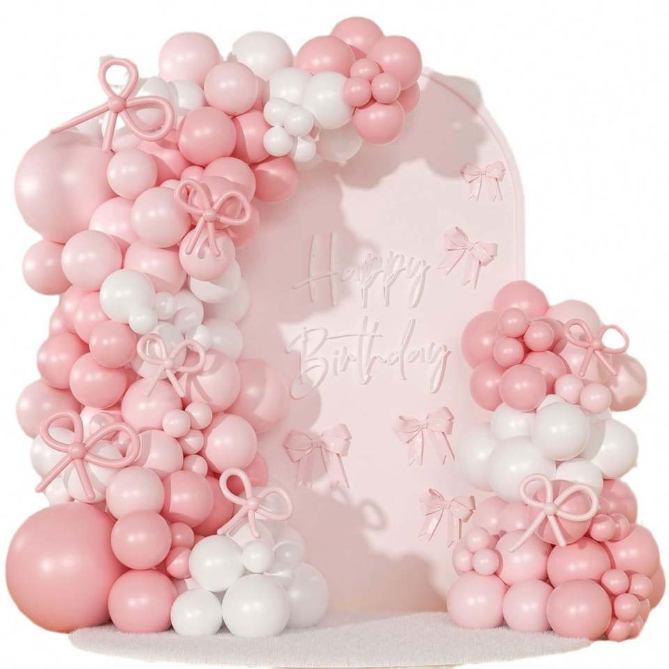 Coquette 147pcs Printed Latex Balloons Kit Pink Bow Birthday Bridal Shower Valentine's Day Decorations Includes Pink Ribbon Arch