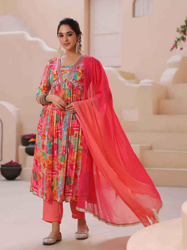 Coral Floral Printed Kurta With Solid Trousers And Chiffon Dyed Dupatta Embroidered Square Neck Kurta With Drawstring