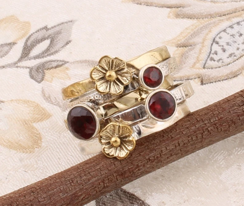 Coral Gemstone Plain Boho Design Spinner Ring Handmade Silver Brass Carved Thumb Anxiety Worry Meditation Three Wedding Party
