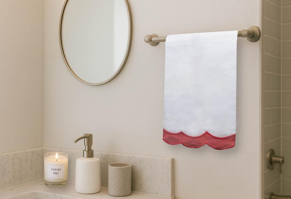 Coral Red Border Linen Guest Towel, Decorative Framed Hand Towel, Absorbent Linen Cotton Bathroom Kitchen Decor