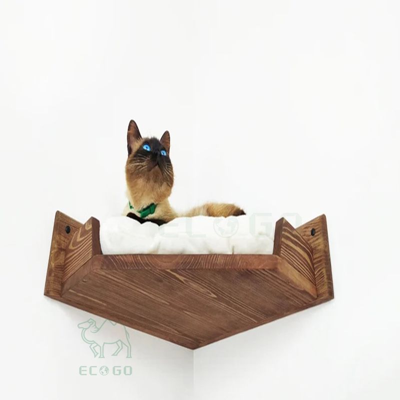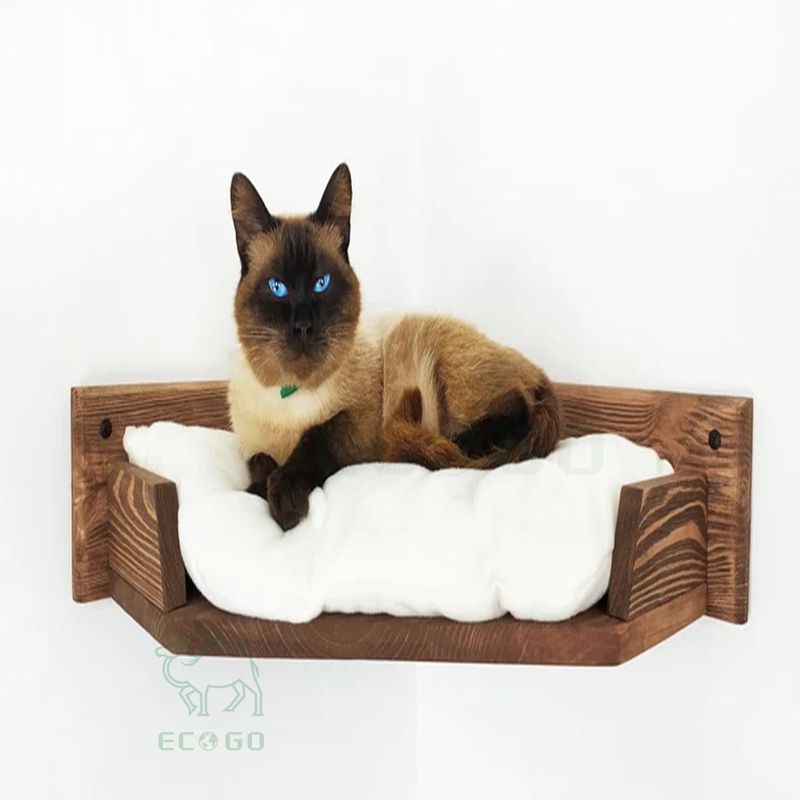 Modern Solid Bamboo Corner Wall Mounted Cat Bed Cave with Soft Cushion for Indoor Cats Resting and Window Perch