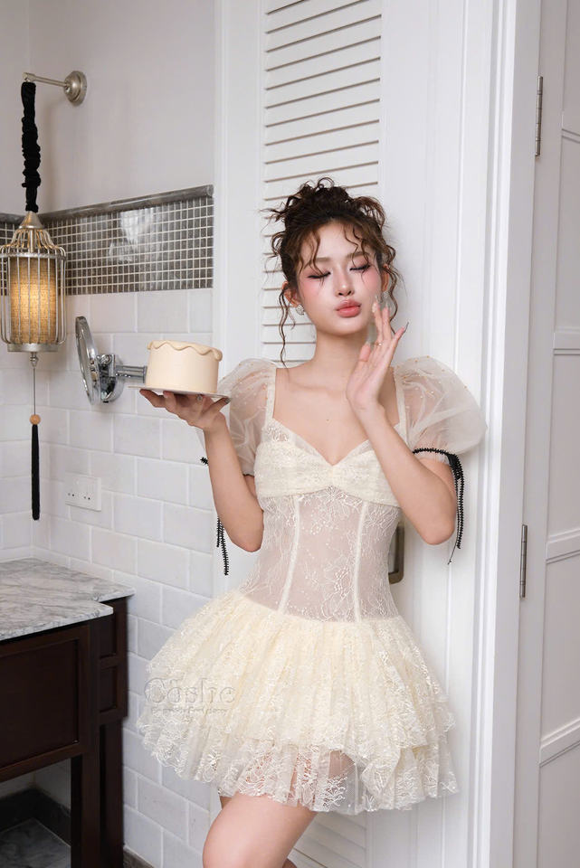 Coshe Bonita Women's Dress Trendy Sleeved Stunning Flower Pleated Skirt Youthful Elegant Sweet Street Casual Look