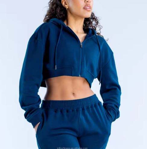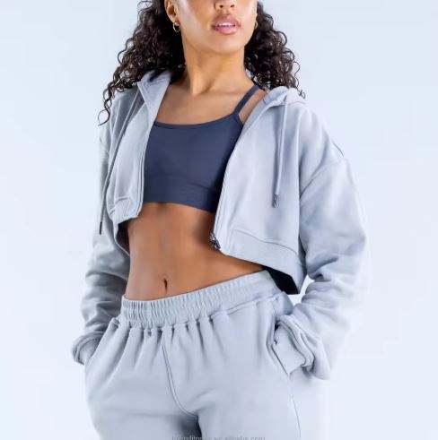 Cotton French Terry High Quality Vintage Loose Blank Lounge Oversize Drawstring Jogger Zip up Drop Shoulder Crop Hoodie Womens