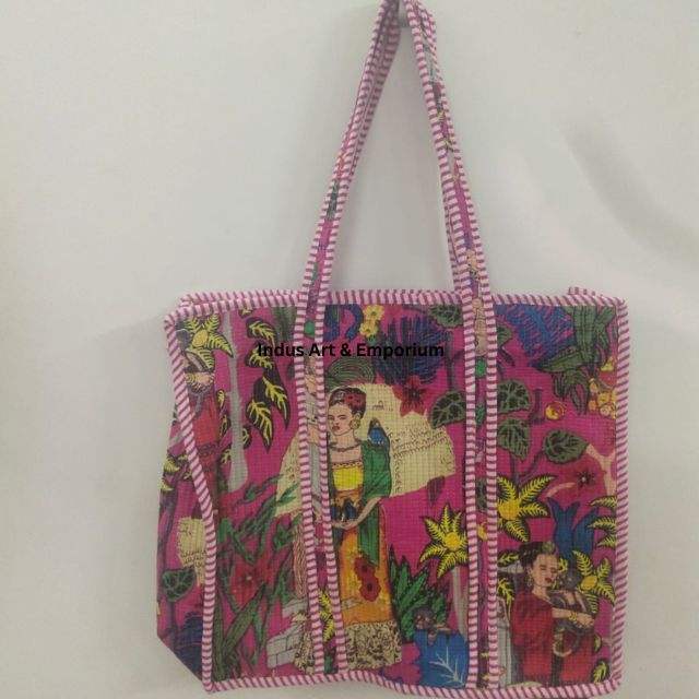 Cotton Handprinted Reversible Large Peach Red Tote Bag Eco-Friendly Sustainable Sturdy Grocery Shopping Bag Quilted Bags