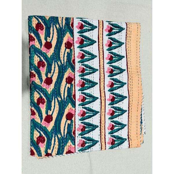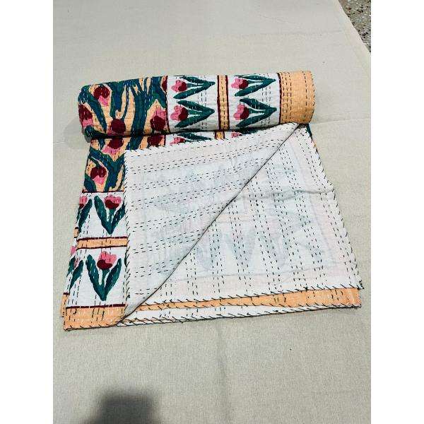 Cotton Kantha Quilt Bedspread With Hand Block Printed Textile Art Designed For Everyday Bedding Warmth And Elegant Interior