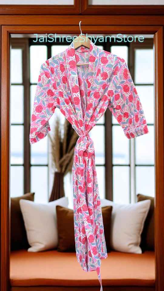 Cotton Kimono Style Robe With Traditional Floral Block Print For Woman Relaxed Home And Night Wear Lounge Sleep Home Spa