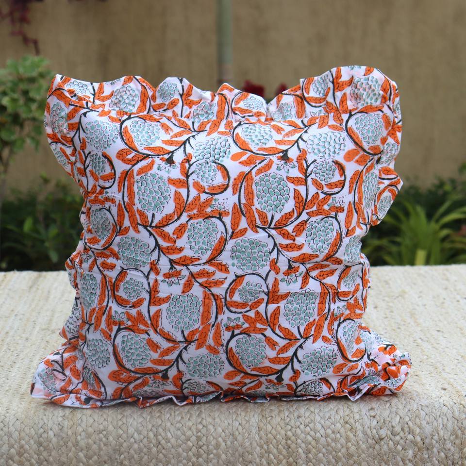 Cotton Linen Blend Indian Vintage Flowers Block Print Cushion Covers Ruffles Colorful Floral Frill Pillowcase