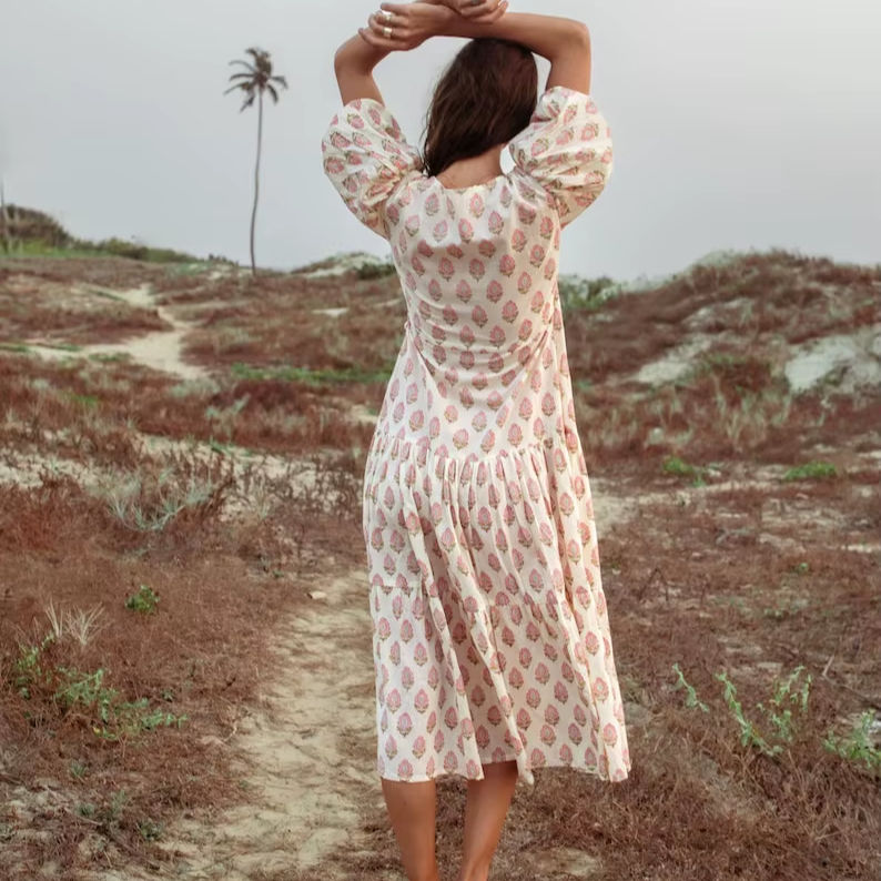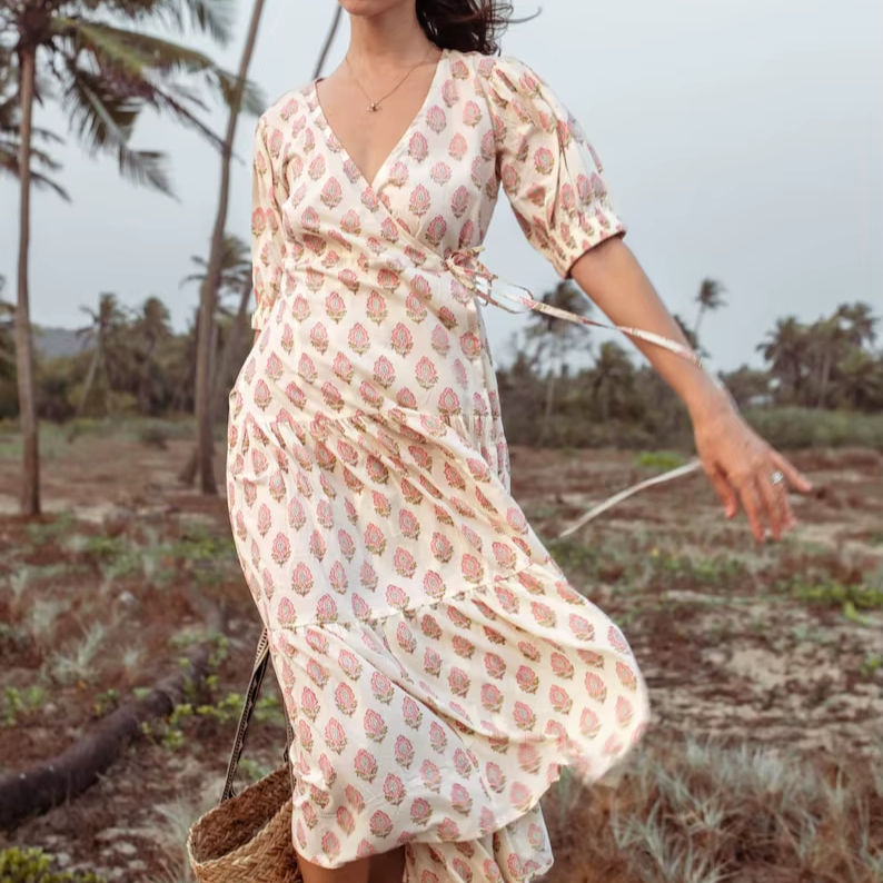 Cotton Long Maxi Wrap Dress Indian Block Print Tiered Boho Gown | Puff Sleeve Summer Dress Custom Wedding & Honeymoon Outfit