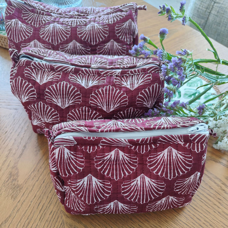 Cotton Quilted Cosmetic Pouch Set, 3-Piece Floral Makeup Bag,Wine Shell Toiletry Pouches (Set of 3)