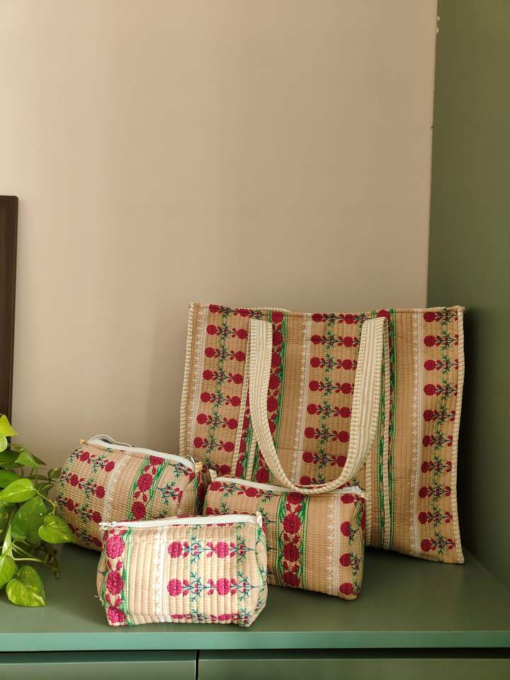 Cotton Quilted Cosmetic Pouch Set, 3-Piece Floral Makeup Bag,Indie Floral Beige Toiletry Pouches Set of 3