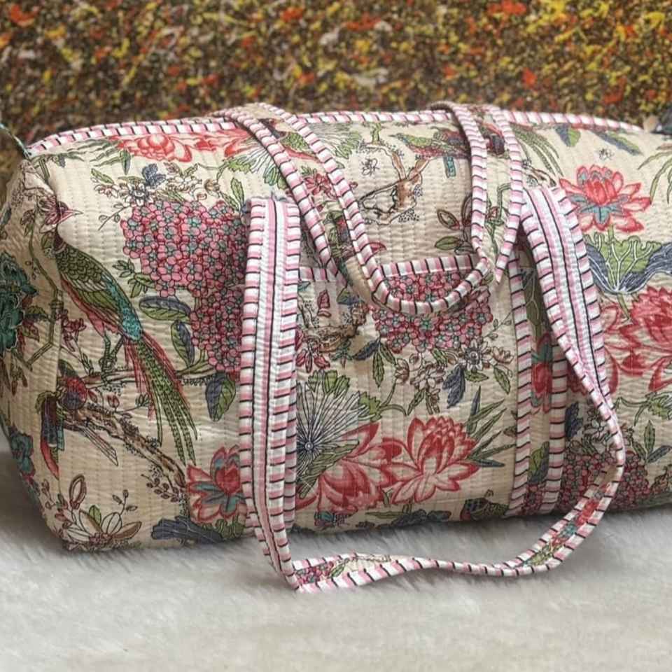 Cotton Quilted Duffle Shoulder Travel Bag with Two Handles Floral Kantha Design Open Closure Shopping Bag