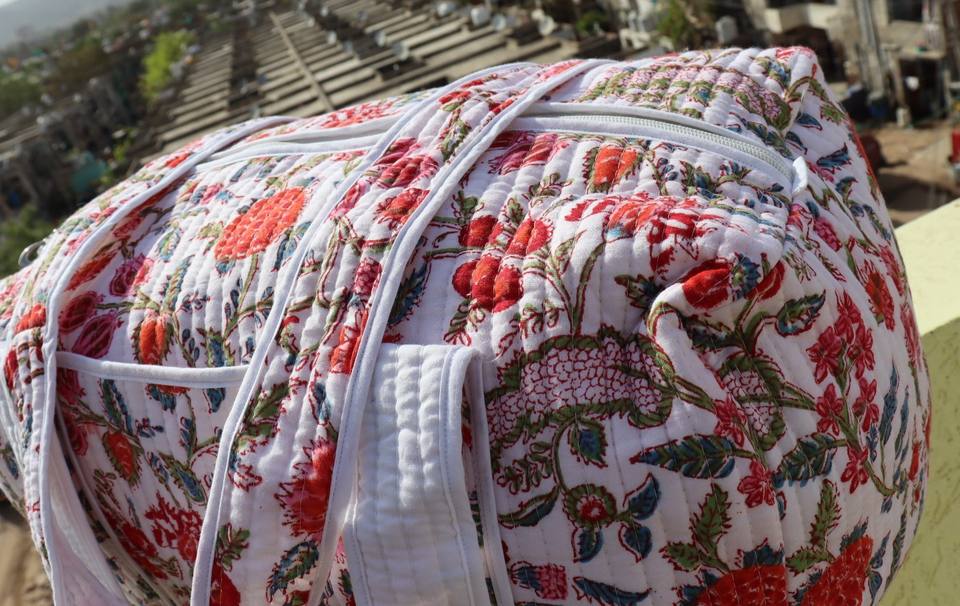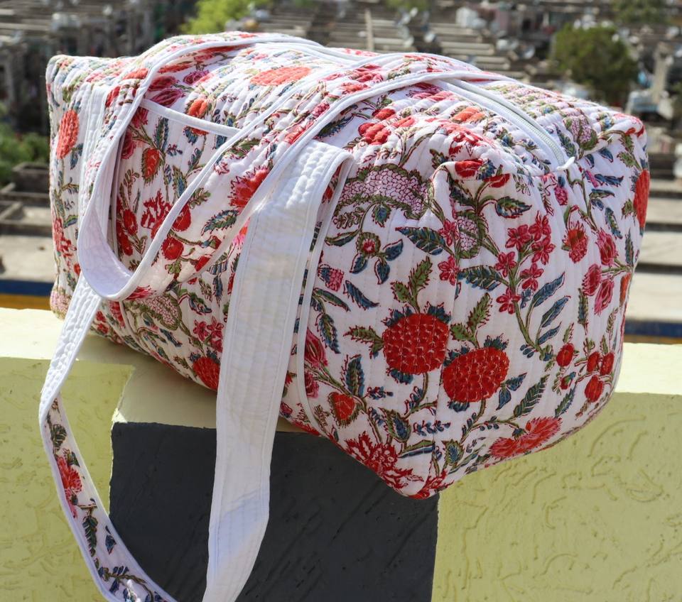 Cotton Quilted Duffle Tote Shoulder Bag Geometric Eco-Friendly Two Straps Canvas Lining Zip Fashionable Overnight Washable