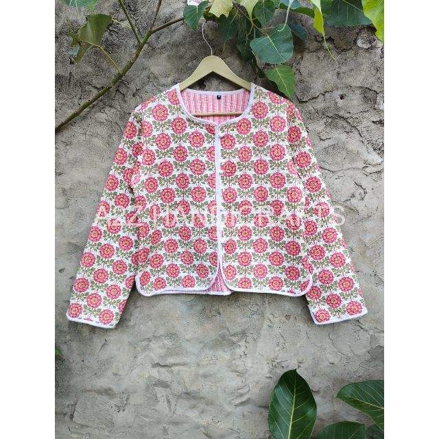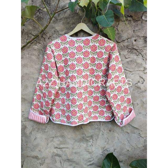 Handmade Reversible Quilted Jacket for Women Unisex Floral Print Knitted Pocket Silk Lining Button Party Wear Gift for Winter