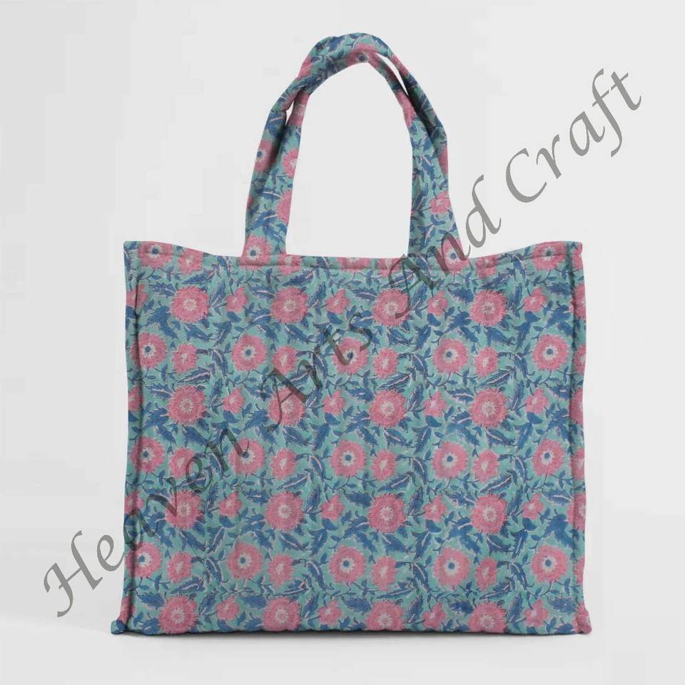 Cotton Quilted Square Indian Hand Block Floral Printed Quilted Tote Bag Large Casual Trendy Custom Fashion Accessory Bag