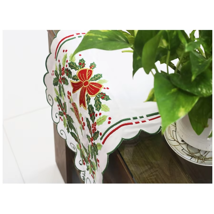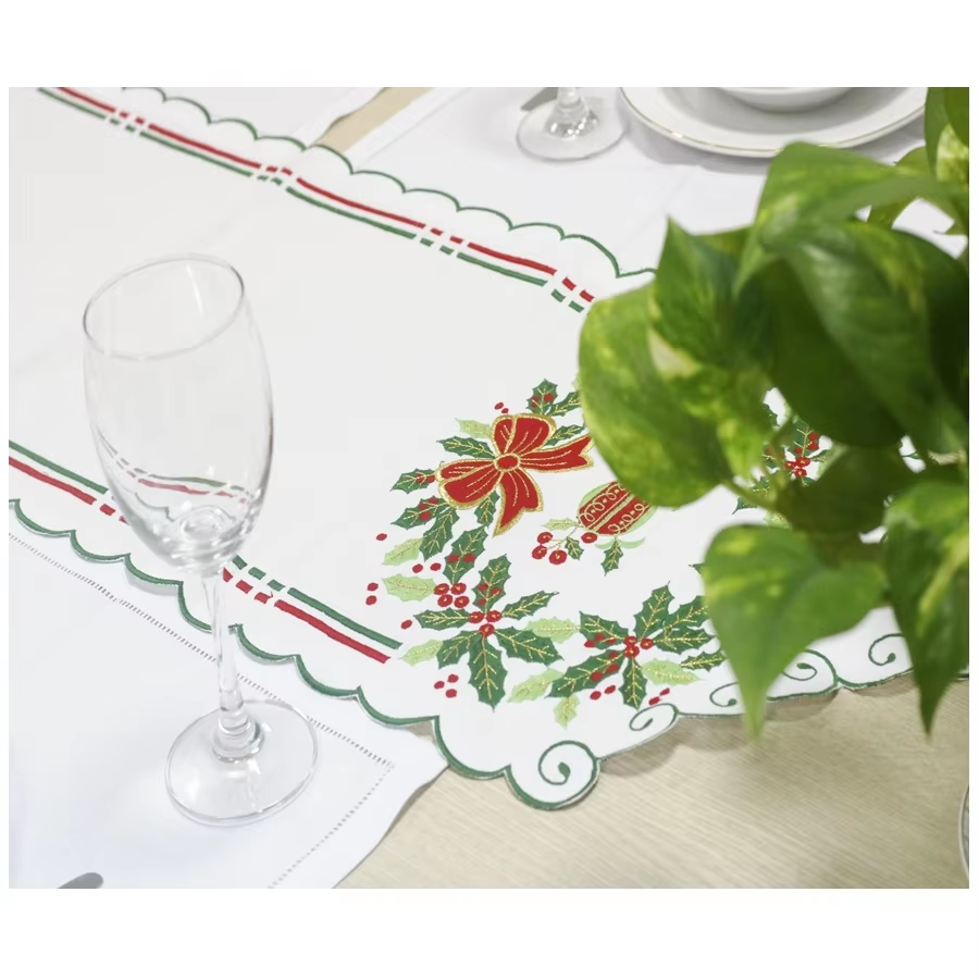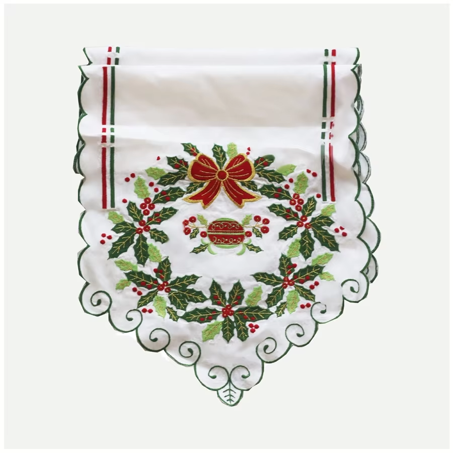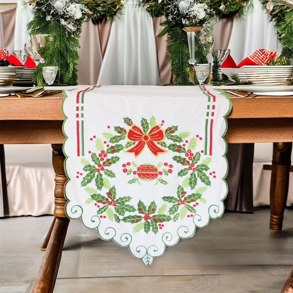 Cotton Scallop Border Table Runner Custom Wholesale Embroidery Holly and Red Bow Christmas Runner Home Holidays