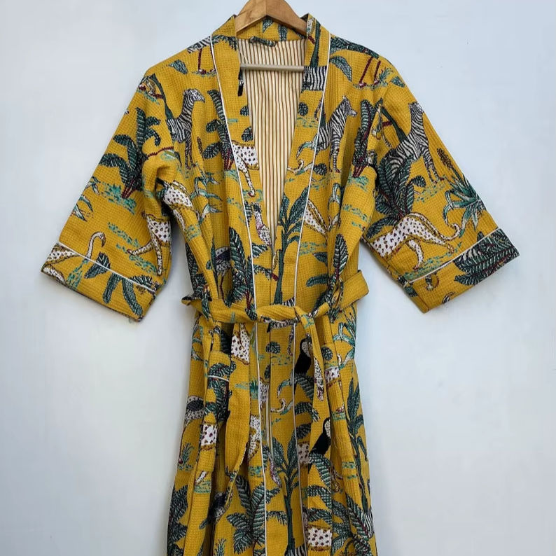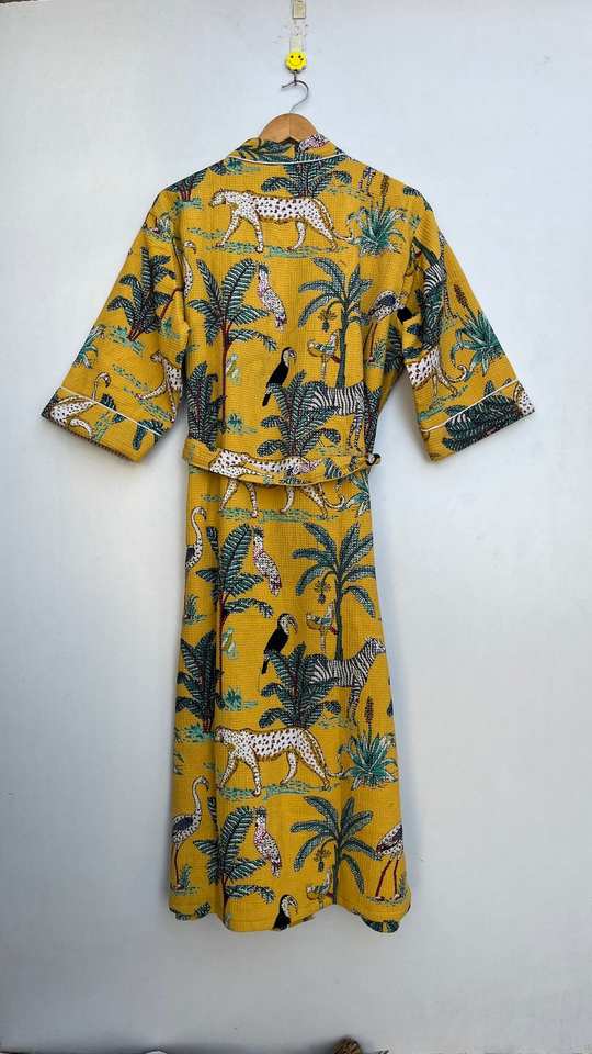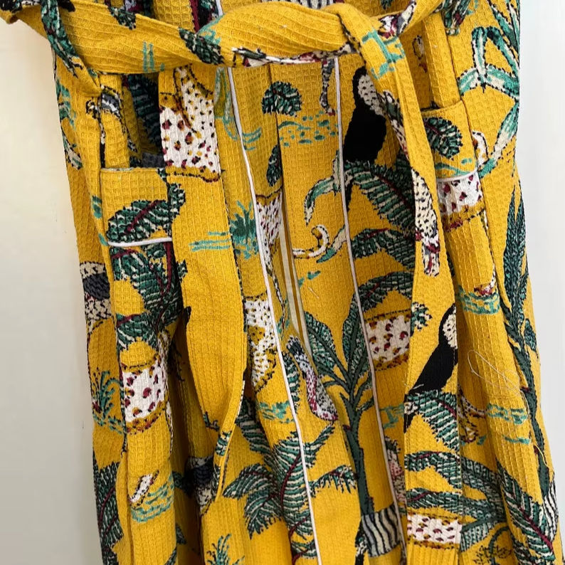 Cotton Waffle Kimono Robe Animal Print Spa Bathrobe Soft Absorbent Relaxed Fit Home Wear