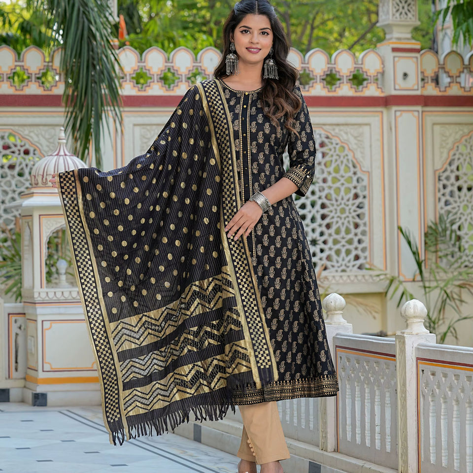 Cotton gold print anarkali kurta with dupatta black color festive wear comfortable fit traditional indian ethnic attire elegant