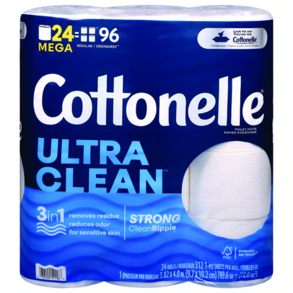 Cottonelle Ultra Clean Toilet Paper, Strong Toilet Tissue, 24 Mega Rolls