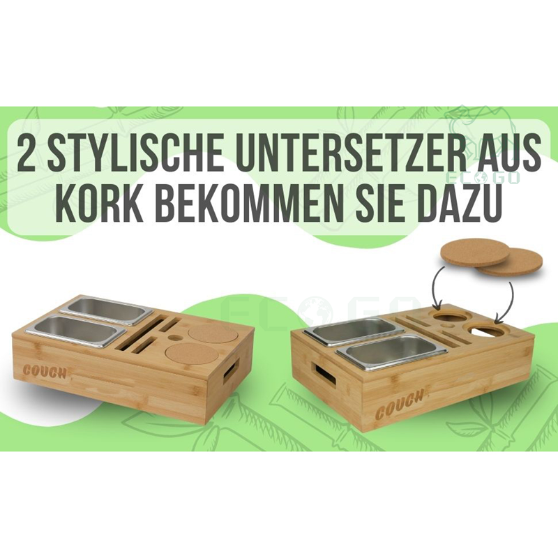 Couch Bar Sofa Tray with Drink Holder and 2 Stainless Steel Chips Bowls Including 2 Cork Coasters - Sofa Organizer