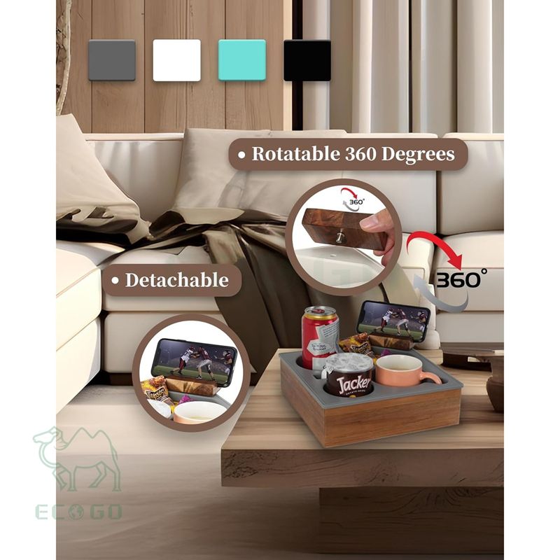 Couch Cup Holder Tray, Soft Silicone Acacia Wooden Couch Caddy Car Seat Beach Organizer, Waterproof Anti-Spill Sofa Cup Holder