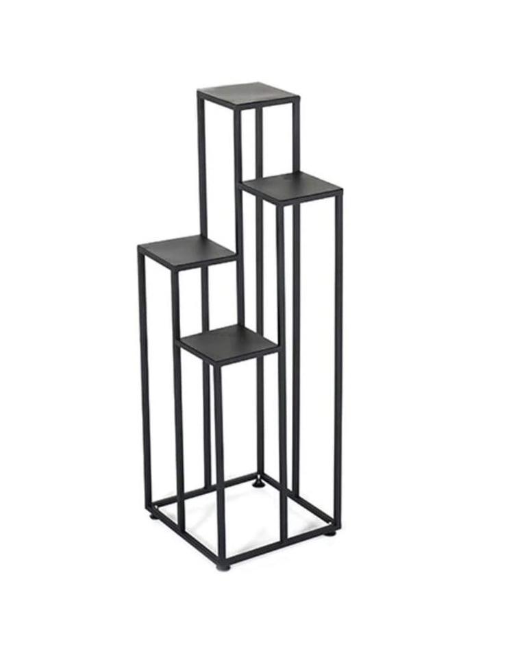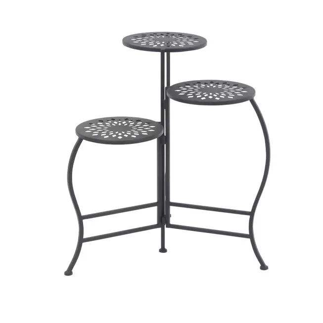 Country style black metal flower pot stand with floral cutouts and durable strong legs for long term garden use