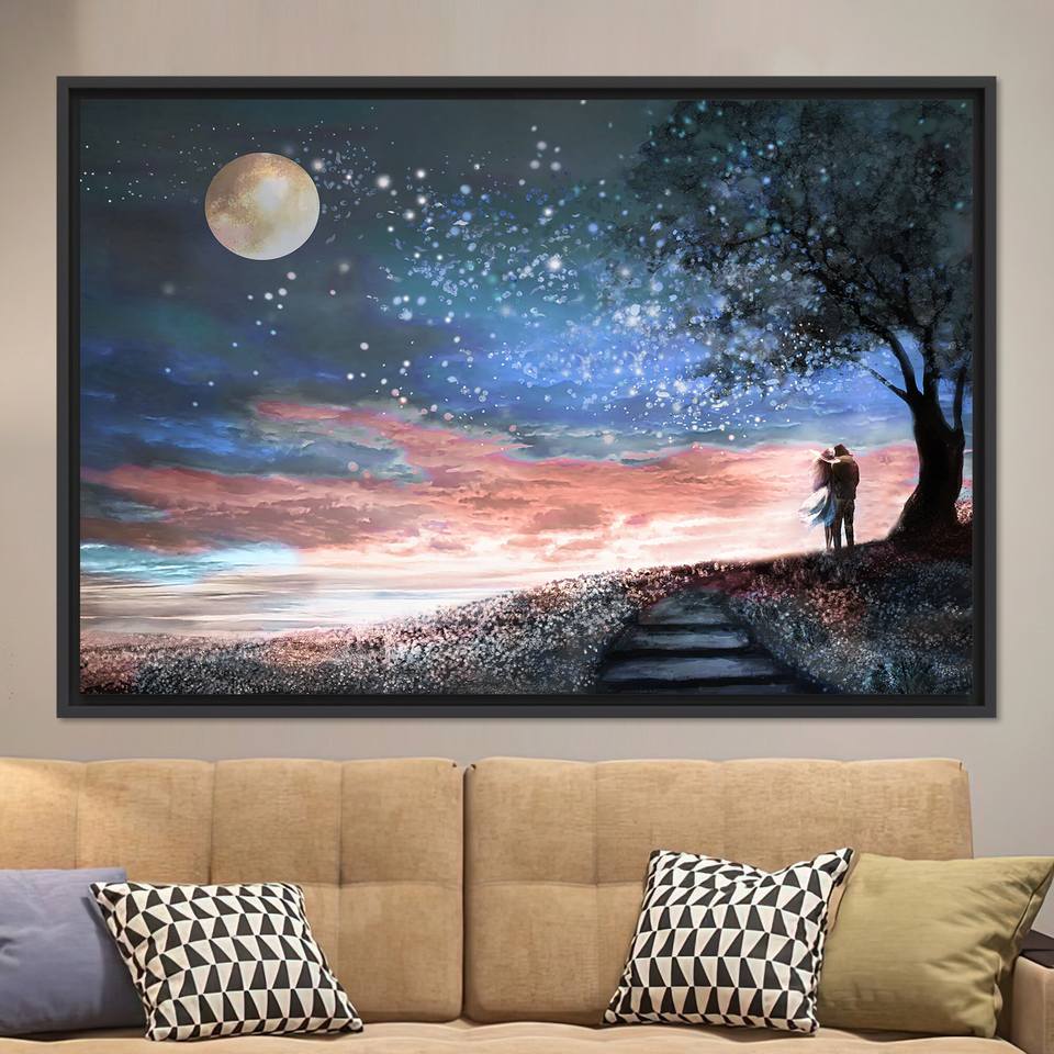 Couple Under Stars: Elegant Printed Canvas Wall Art for Home Decor,BLACK FRAMED CANVAS