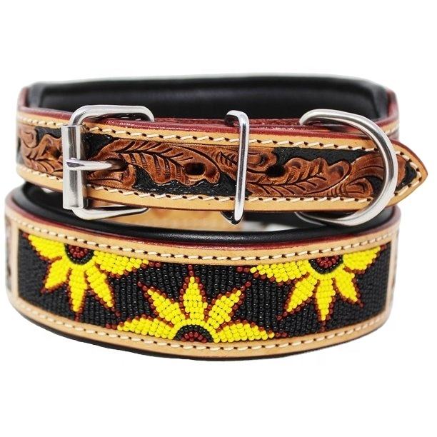 Cow Leather Soft Padded Sunflower Bead Design Dog Collar Hand Tooling Dog Belt Carving Pet Collar Top Wholesale Manufacturer
