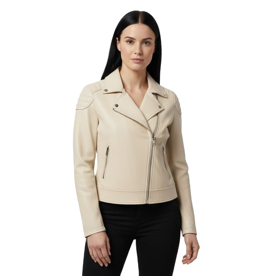 Cowhide Cream Leather Motorbike Jacket Women Custom Bulk Wholesale Factory Price Genuine Biker Style Ladies Coat OEM Service
