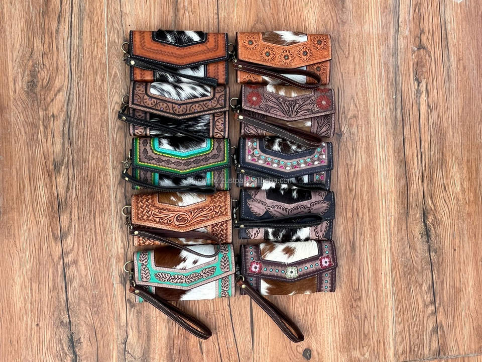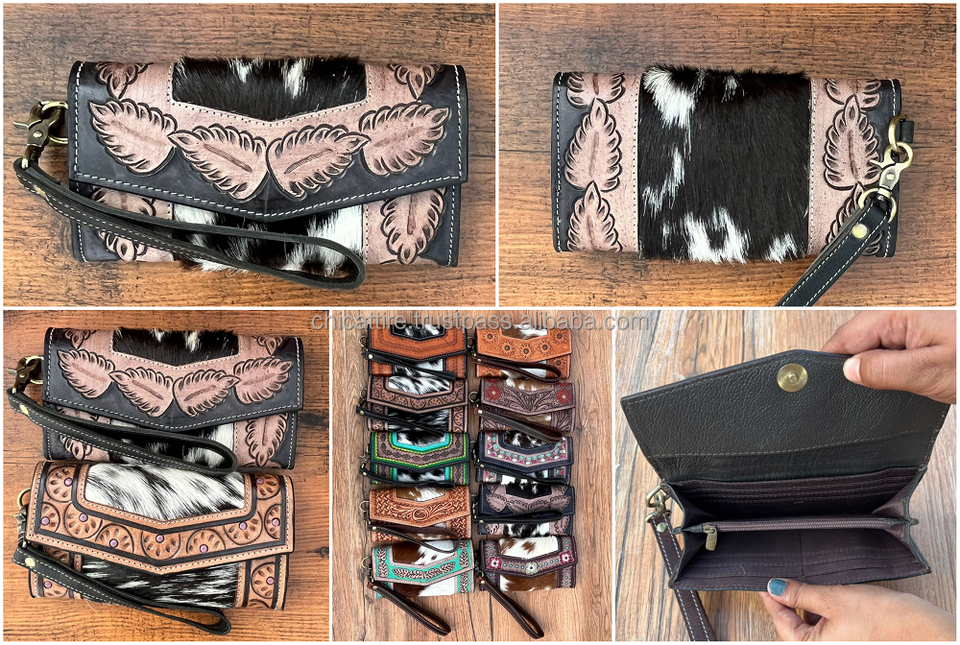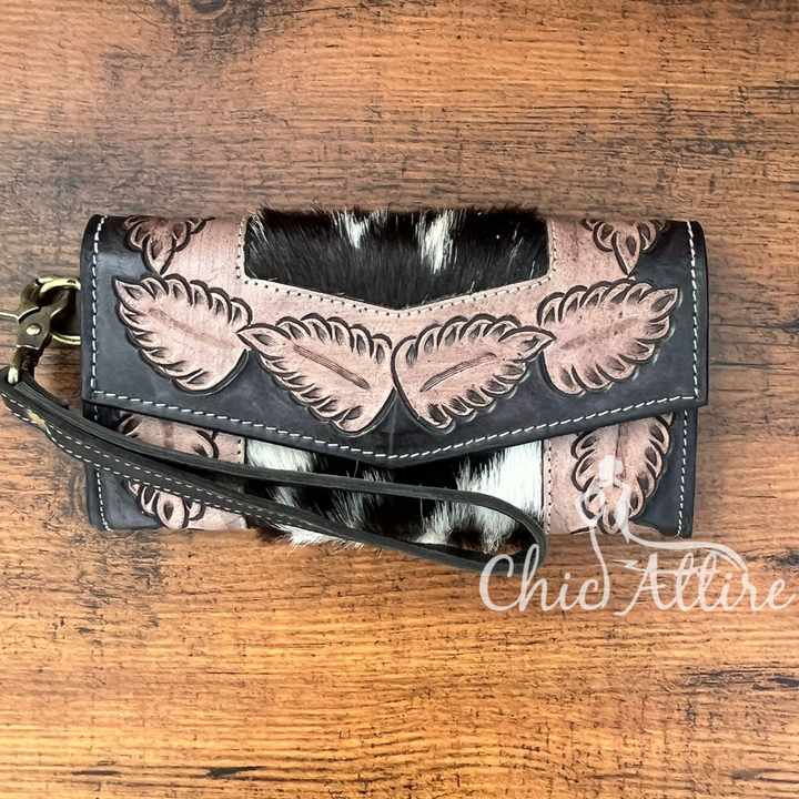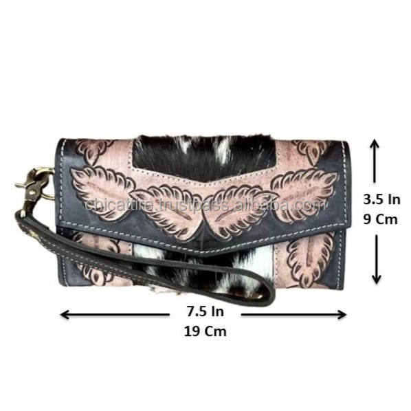 Stylish Luxury Cowhide Fur Clutch Multi-Use Hand Tooled Long Leather Wallet with RFID Feature Logo Pattern Card Holder for Women