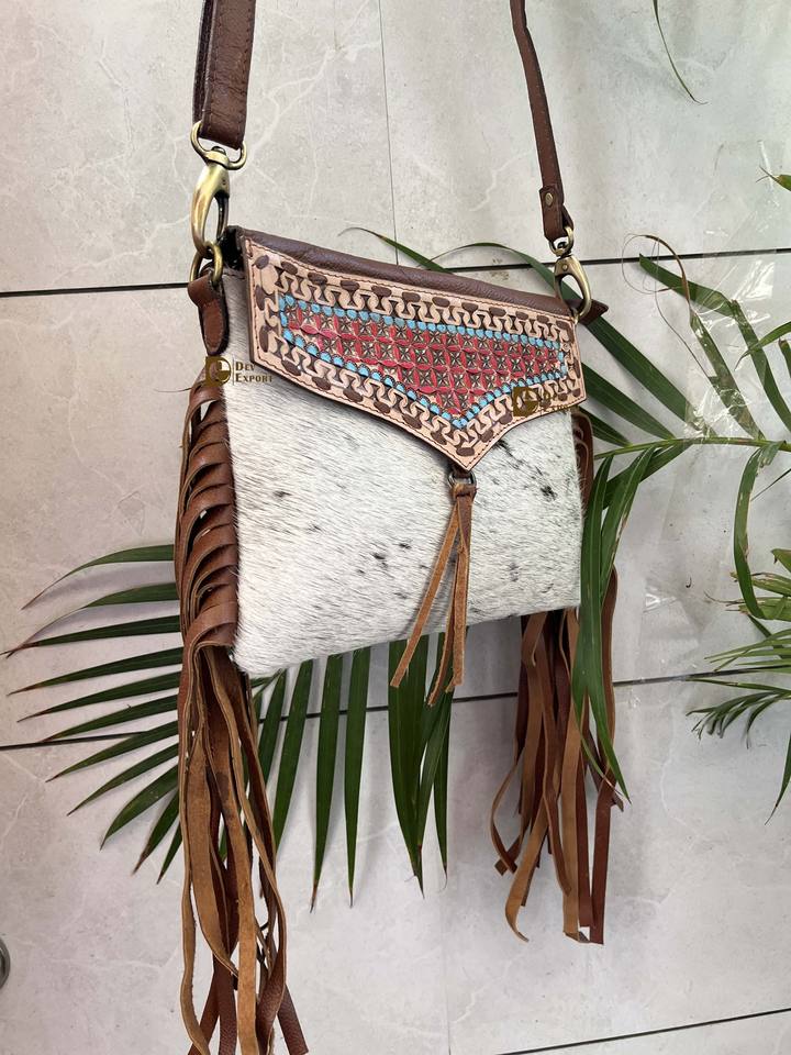 Cowhide Fur Leather Fringe Hand Tooled Carving Leather Handbag Sling Bag Gypsy Boho Handmade Western Stylish Multi Uses Bags