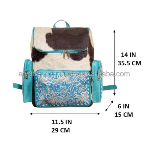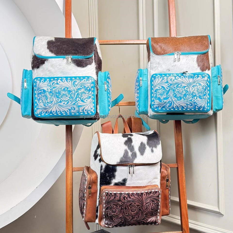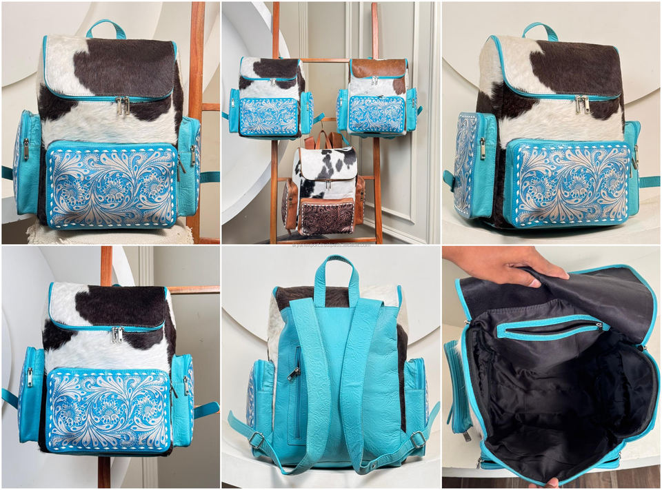 Cowhide Fur Leather Hand Tooled Carving Stylish Backpack School Bags Turquoise Color Unisex Beautiful Designer Bag Multi Use Bag