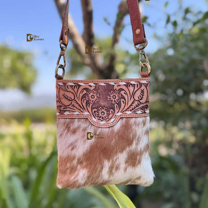 Cowhide Fur Leather Handbag Hand Tooled Carving Leather Small Size Sling Bag Gypsy Boho Handmade Western Stylish Multi Uses Bags