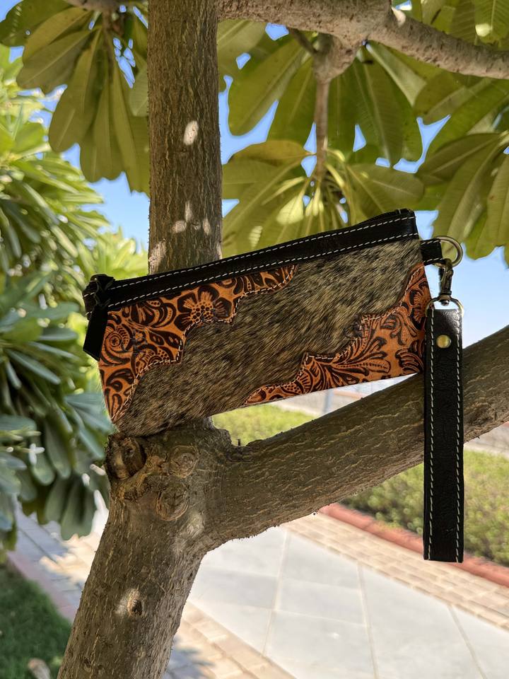 Cowhide Fur Leather Wristlet Clutch Purse Pouch Black Wallet Carving Tooled Western Design Hair on Hide Fur Leather Clutch