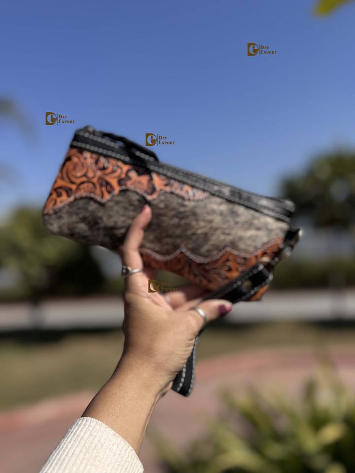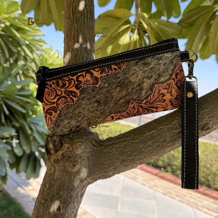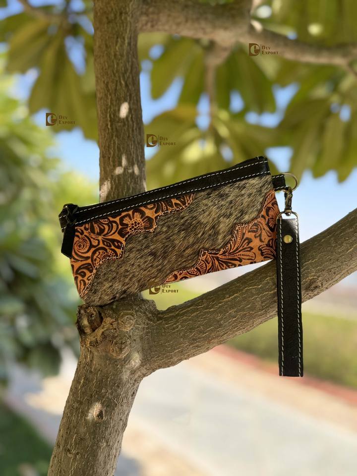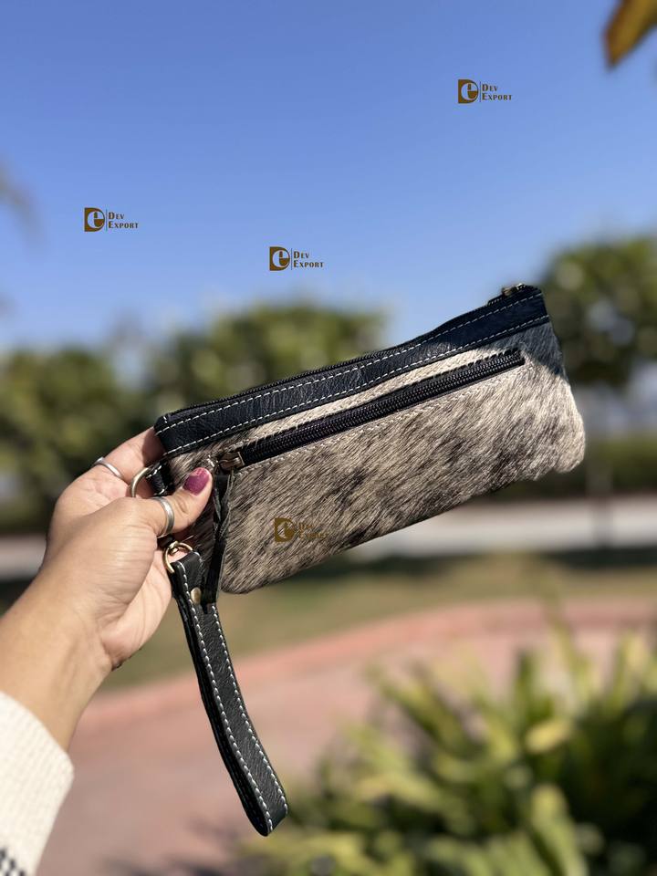 Cowhide Fur Leather Wristlet Clutch Purse Pouch Black Wallet Carving Tooled Western Design Hair on Hide Fur Leather Clutch