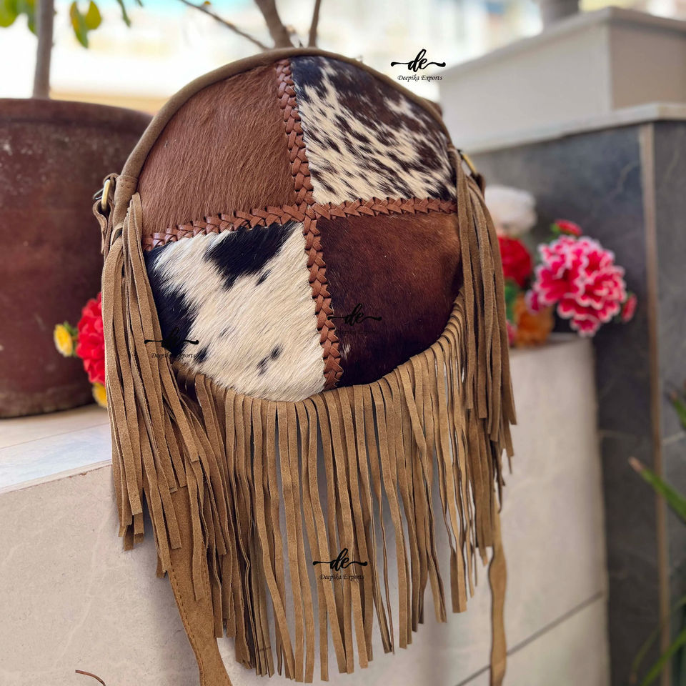 Cowhide Fur Sling Bag Handbag New Designer Stylish Western Collection of Fringe Crossbody Shoulder Round Bags Women's Use Purse