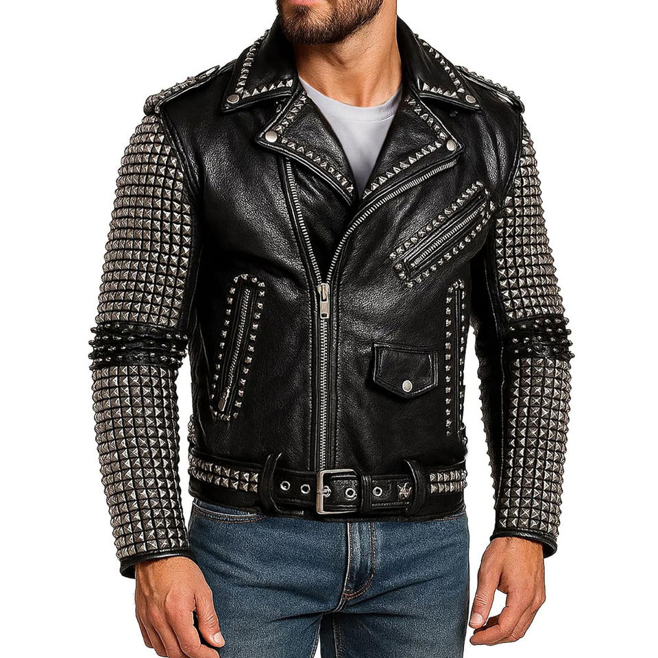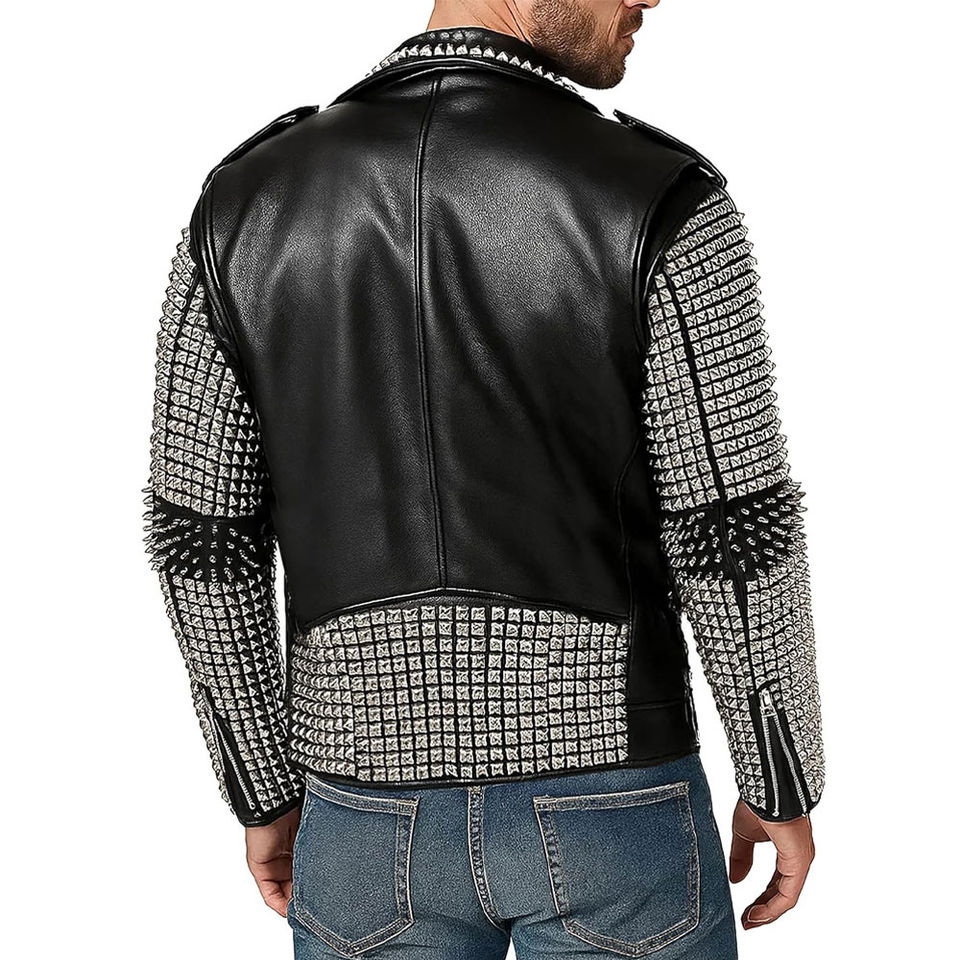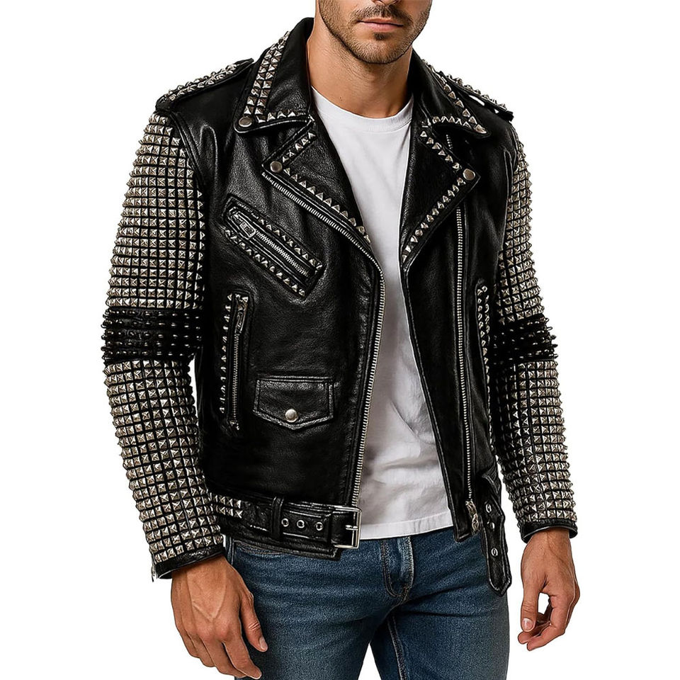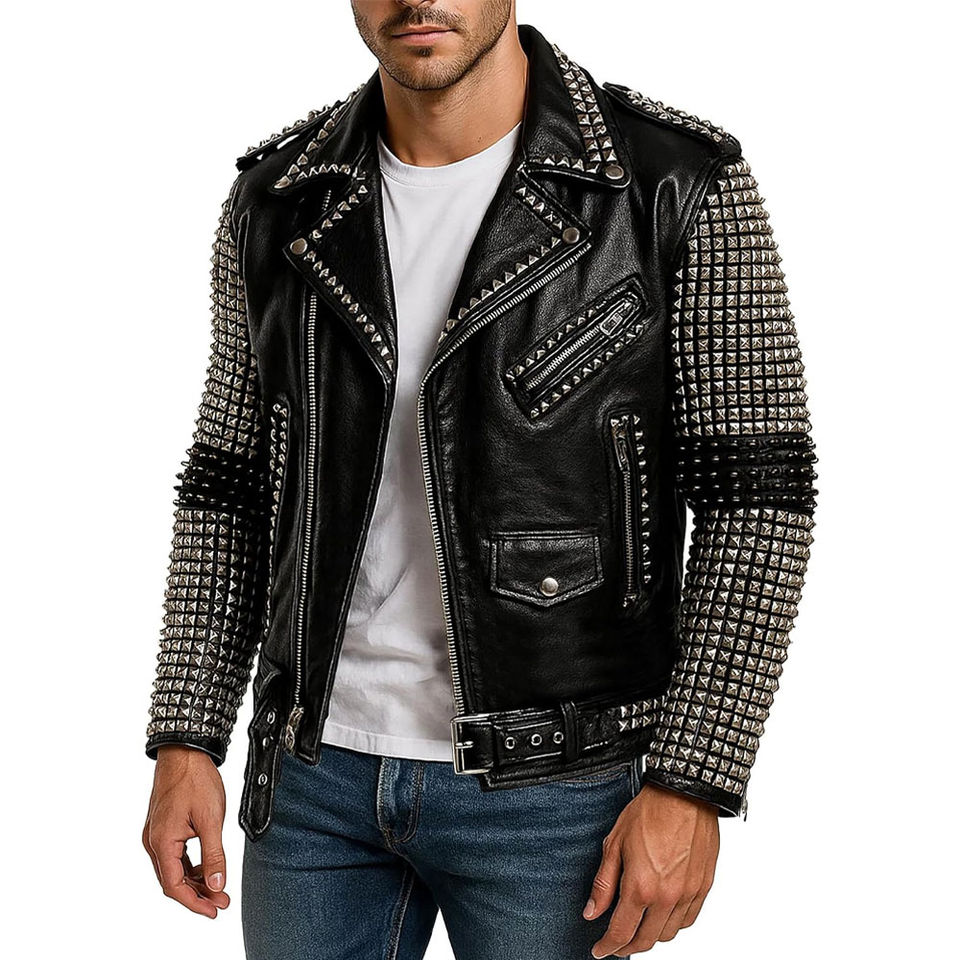Cowhide Punk Rock Metal Spiked Studded Genuine Leather Reversible Breathable First Layer Rock Star Style Jacket for Men