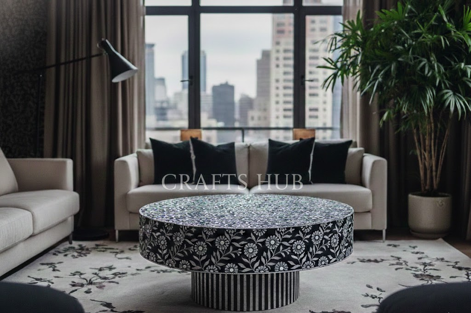 Craftshub Handmade Modern Design Black White Bone Inlay Wooden Dining Table Polished Finish Portable Home Office Farmhouse Hotel
