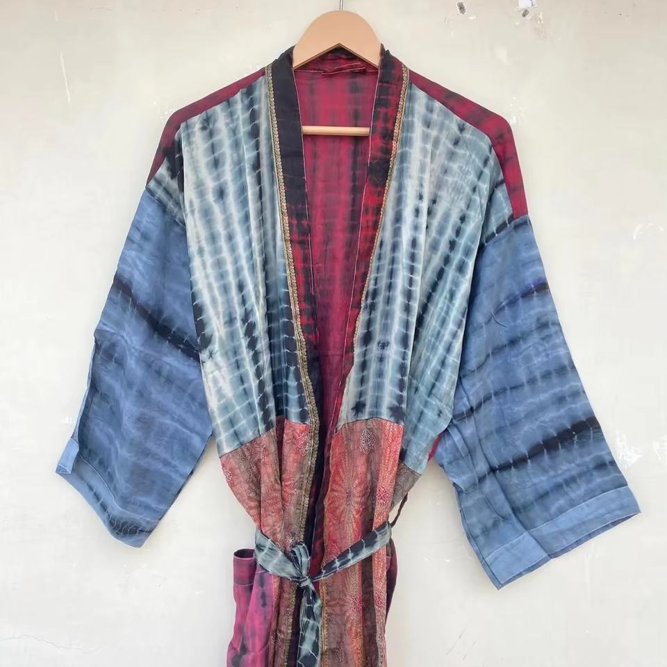 Chiffon Bath Robe Women's Tie Dye Floral V-neck Full Length High Quality Soft Smooth Breathable Summer Machine Embroidery