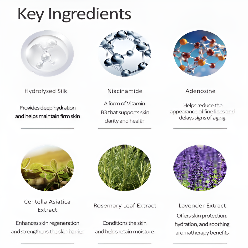 Niacinamide, Centella, Hydrolyzed Silk, Rosemary Leaf Extract, Lavender Extract, adenosinemain ingredient
